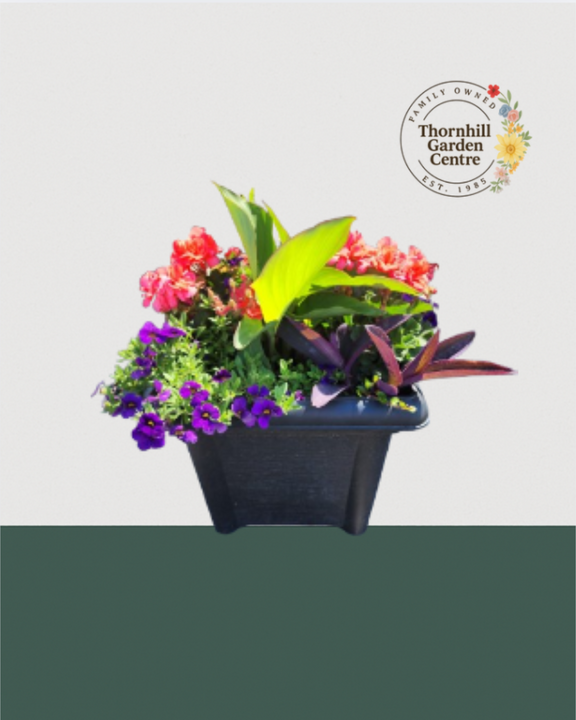Turn up the heat in your garden with the Sunset Gem Mix. This bold square planter features a tropical centre of canna and tradescantia, surrounded by fiery red geraniums, rich violet calibrachoa, and trailing greenery that softens every edge. The deep, structured container offers a modern touch while allowing each colour to shine in full sun.