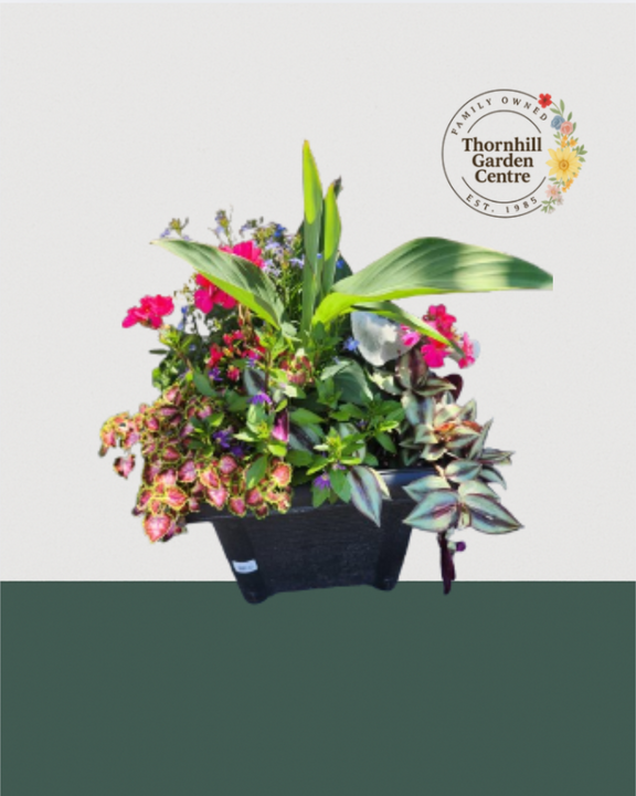 Add a burst of exotic flair to your space with the vivid, playful energy of the Tropical Shine Mix. This premium square planter is alive with bold textures and striking color, featuring hot pink geraniums, lush green canna leaves, radiant coleus, and shimmering tradescantia. Deep purples, emeralds, and ruby accents mingle for a dazzling look that brings the tropics to your doorstep.
