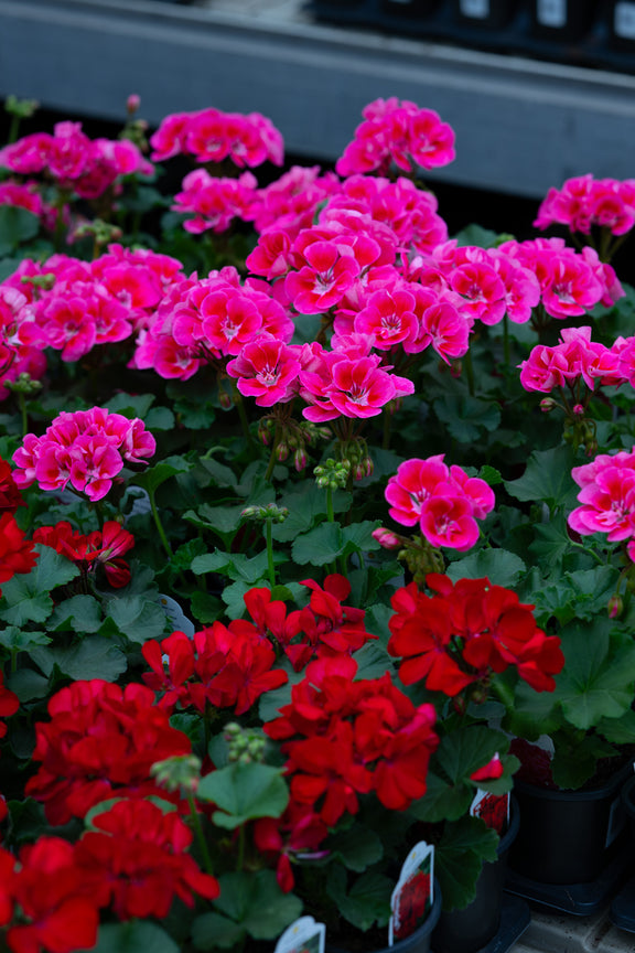 Make a statement with the vibrant Raspberry Punch Geranium. This stunner showcases clusters of hot pink, raspberry-hued blooms with delicate white accents, standing tall above rich green foliage. Perfect for garden beds, planters, or window boxes, this variety delivers continuous color and a lush, full habit all season long.